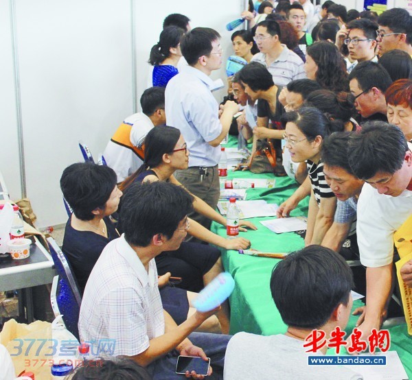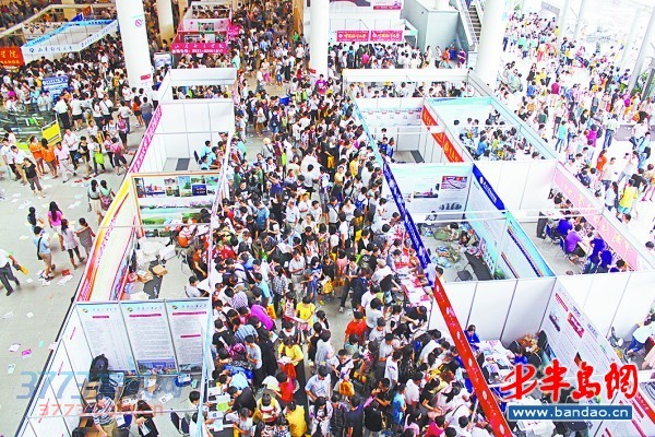 山东财经大学的摊位前,家长和考生挤着往前咨询预估分和专业等情况。