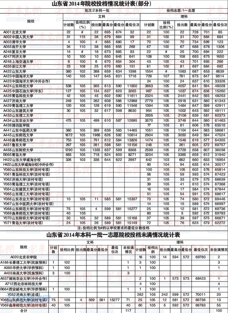 7月18日,2014年普通高校招生普通文理类本科一批、农村专项计划第一次填报志愿投档,共投出考生68144人。当天省招考院发布了山东省2014年本科一批第一次填报志愿院校投档情况统计表,从投档表来看,平行志愿发挥出威力,一志愿投档结束后,文科录取未满院校只剩6所,理科录取未满院校只剩9所,各大名校今年无一爆冷,揽足高分生。而省内高校中,除了部分高校的走读和农村专项未满额外 ,其余高校全部在一志愿完成计划,且收分不低。