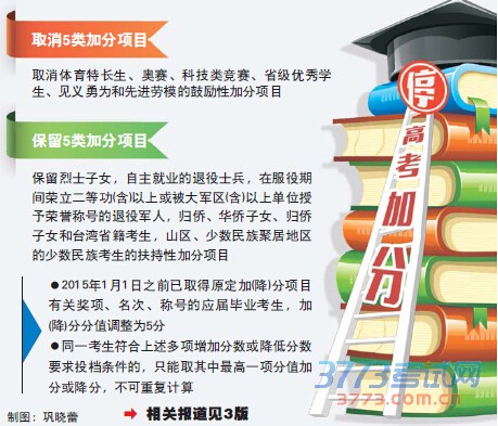 自2015年1月1日起,我省对国家明令取消的“体育特长生”“奥林匹克竞赛获奖学生”等5类鼓励性加分项目予以取消;对国家明确保留的“烈士子女”“少数民族”等5项扶持性加分项目予以保留;并对个别保留项目的加(降)分分值进行调整。