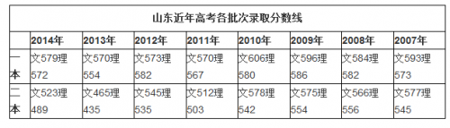 根据3773考试网高考志愿填报参考系统显示:2007-2014年山东高考各批次录取分数线为