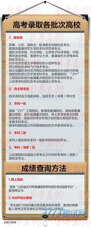 6月24日下午4时,省教育厅将召开今年普通高考第二次新闻发布会,公布多项重要高考信息,发布会后考生将可查到自己的高考成绩。根据往年情况,当天还会发布本科一批录取分数线、成绩位次等信息。成绩公布后,各批次填报志愿也将陆续展开。 一本线、军检线今日发布 23日,省教育厅发布通知,2015年山东省普通高考第二次新闻发布会定于6月24日16时举行,主要内容为公布今年本科一批录取分数线,同时就统一划线情况做相关说明。根据往年的发布情况,当天将公布事关考生填报志愿的重要信息,那就是分数线和分数段。当天公布的分数线一般为本科一批分数线,本专科军检资格线,体育、艺术类专业本科文化分数线等。 公布的这些分数线对考生来说有什么参考价值?本科一批院校除了传统的211和985大学外,省属重点大学以及部分本科高校的部分专业也在一批次招生中。如果想要考入这些大学,首先要过一本线这个门槛。虽然只有达到一本线的考生才有资格填报本科一批志愿,但并不是所有达到一本线的考生,都一定会被本科一批高校录取。因为按照往年惯例,山东省的本科一批录取控制分数线按其招生计划1:1.2全省统一划定,也就是说达到一本线的考生比招生计划数要多,将有部分考生从本科一批中落榜。 24日公布的本专科军检资格线一般比一本线低几十分,在原来本科军检线相当于本科二批线,但山东的本科二批和本科三批合并后,本科军检线不再具有预估本科二批线的功能,是作为军校、国防生以及公安类本科生报考的依据,只有达到军检线的考生,才有资格报考。体育、艺术类专业本科文化分数线也将划定,达到本科线的艺体考生,有资格报考艺体类本科志愿。