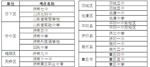 案,济南市在历下区、市中区、槐荫区、天桥区、历城区、长清区、平阴县、济阳县、商河县、章丘市等10个县(市、区)设置10个考区,设置考点的数量达24个。