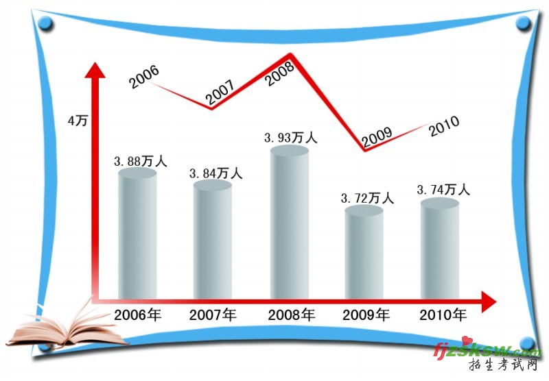 据介绍,济南市普通高考报名人数近几年来并未呈持续下降趋势。其中,2009年济南市报名参加普通高考的考生为37200人,比2008年减少2000余人;2008年比2007年增加了近千人,报名人数为3.93万人;2007年为3.84万人,比2006年减少了400余人,2006年为3.88万人。2010年,济南市普通高考报名人数不降反升,比2009年增加了200余人。