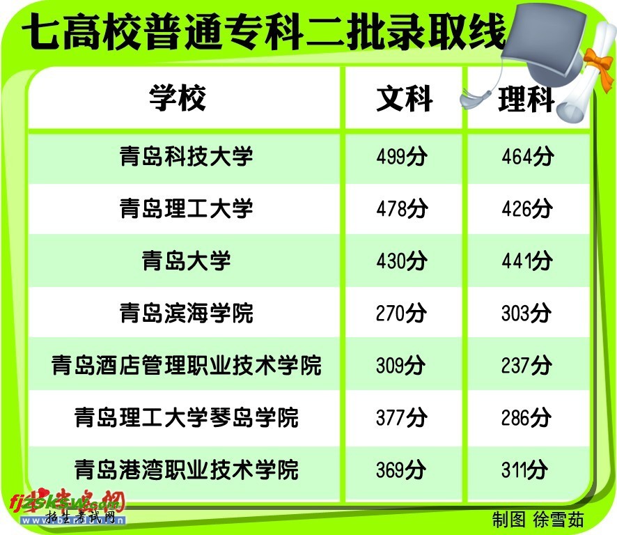 七高校专二一志愿录满 8月18日,经过两天的录取,专科二批一志愿录取结束,岛城共有7所高校在一志愿文理科全部录满,并划定专科二批录取线。普通本科高校中,青岛科技大学普通专科二批录取线为文科499分、理科464分,学校普通专科二批招生计划都安排在高密校区;青岛理工大学普通专科二批录取线为文科478分,理科426分,学校中外合作办学专业,虽然投档时文理皆满,但实际录取时,文科一志愿录满,理科因为部分高分考生没有签协议退档,还要征集20个计划;青岛大学专科二批录取线为文科430分、理科441分。