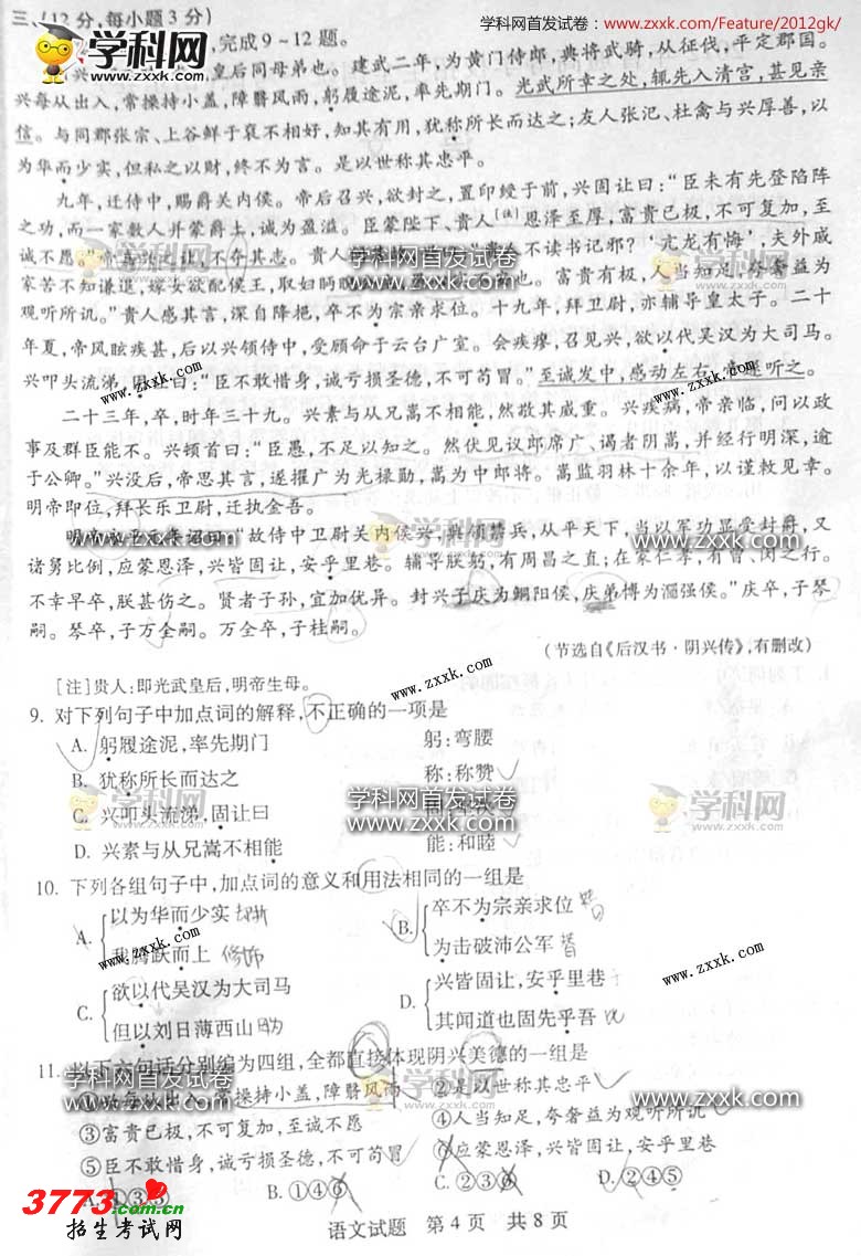 [组图]2012年山东高考语文卷试题答案发布