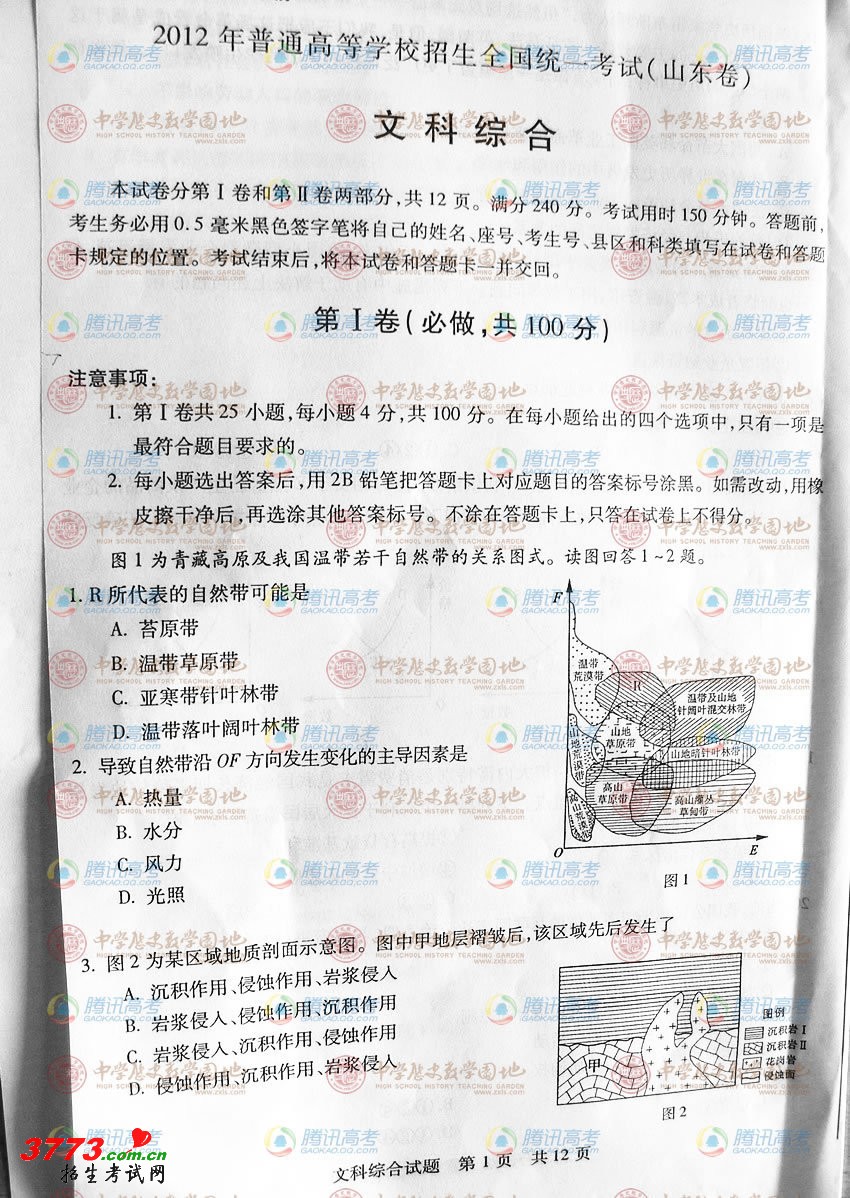 [组图]2012山东高考文科综合文综试卷答案
