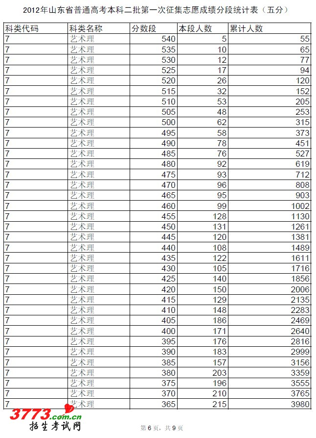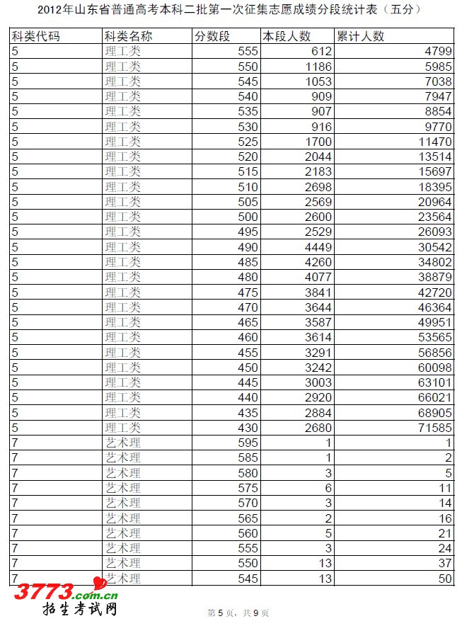 [组图]2012年山东高考本二批第一次征集志愿成绩分段统计表(五分)