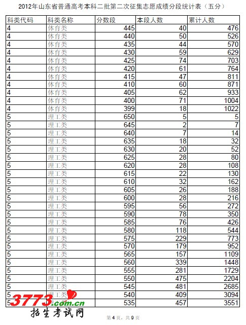 [组图]2012年山东高考本科二批第二次征集志愿成绩分段统计表(5分)