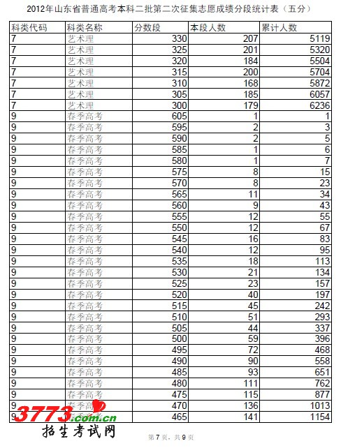 [组图]2012年山东高考本科二批第二次征集志愿成绩分段统计表(5分)