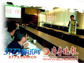 19日下午4时20分,在潍坊一中图书馆一楼,潍坊一中“北大校长实名推荐”面试准时开始。10位在屋外等候的候选人按照抽签的顺序依次进行面试。面试的流程主要有两个步骤,首先2分钟个人陈述,其次由考生领取题目,有2分钟准备时间看题并解答。评委由校长代表、年级主任代表、老师代表、学校中层代表和两名家长代表组成,共7人。评委在白纸上记录每个同学面试情况,全部结束后划票,并将选票投到投票箱。