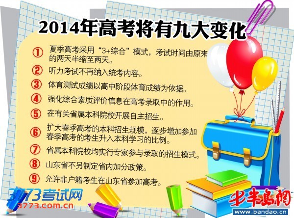 今年山东高考于6月7日~9日进行,7日上午语文,下午数学,8日上午文科综合和理科综合,下午外语,9日上午进行基本能力测试。文史类考生考语文、数学(文史类)、外语、文科综合(包括政治、历史、地理)、基本能力测试;理工类考生考语文 、数学(理工类)、外语、理科综合(包括物理、化学、生物)、基本能力测试。