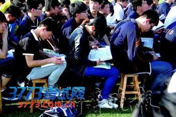 高考来临,一所高中的高三学生在参加毕业典礼大会时抽空学习。 本报记者 刘涛 摄
