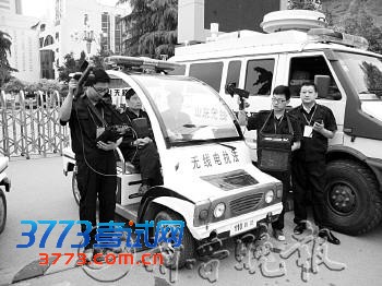 5月31日下午3点,一辆身型庞大的汽车停在了济宁一中太白校区门口,几名身穿黑色制服的工作人员手持外形独特的仪器下车,低头查看着胸前仪器上的显示屏,仪器不时发出“嘀嘀”的响声。“现在大家调到模拟信号源的频率,分开搜索两个模拟信号源的位置。找到之后不要取出来,立即交换位置再进行一次搜索。”在一旁负责指挥的无线电管理办公室副主任陈宏的话音刚落,两组监测员就已经举起手中的便携式测向仪,在一中校门口分别向周围不断探测。