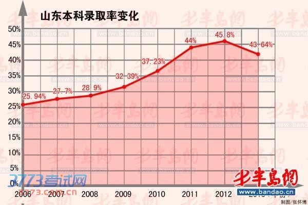 本科录取率,今年山东为43.64%。根据统计,从2006年到2010年,山东本科录取率呈现一路攀升的趋势:25.94%、27.7%、28.9% 、32.39%、37.23%,从2011年开始,本科录取率更是涨势“凶猛”,当年达到了44%,而2012年则高达45.8%。今年,本科录取人数达到256734人,录取人数比去年的252126人增加了4608人,不过由于今年高考人数比去年有所增加,从而导致本科录取率出现了下降。