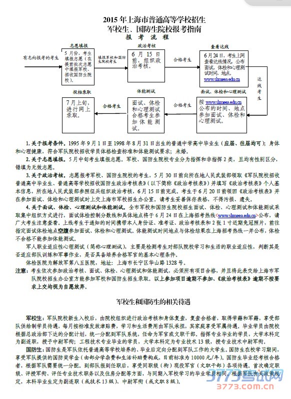 2015年上海市普通高校招生第一次志愿填报已经结束,凡已经报考军校、国防生的考生将根据安排进行政治考核及军检,军检采取全市集中组织方式进行。相关考生需注意以下时间节点及注意事项: