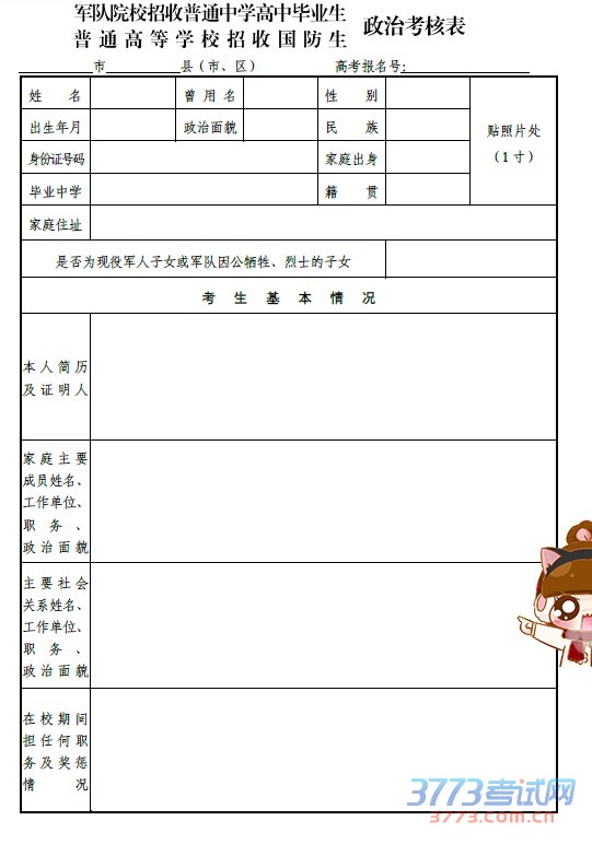 1.5月30日前,考生向所在区(县)人民武装部领取《军队院校招收普通高中毕业生、普通高等学校招收国防生政治考核表》(以下简称《政治考核表》)并填写《政治考核表》个人基本信息,所在区(县)人民武装部参照征兵组织政治考核,6月15日前完成。