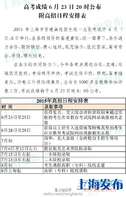 [图文]2015上海高考成绩23日20时公布 高招日程安排表