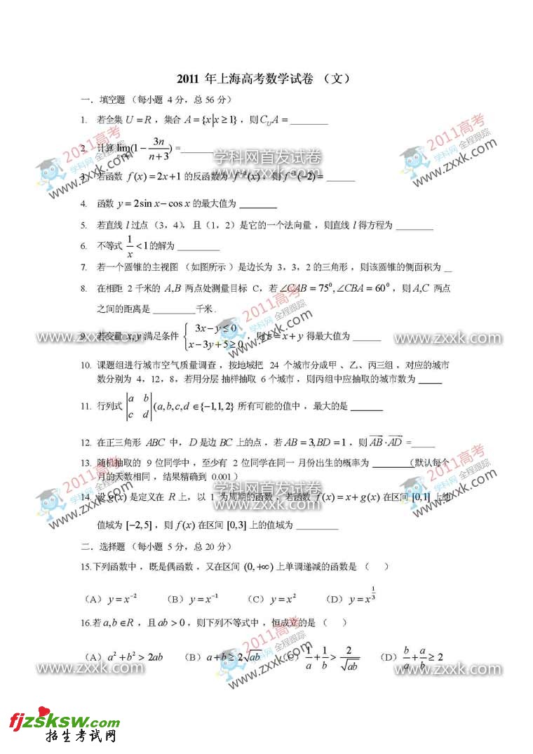 [组图]上海市2011年高考文数试题及答案