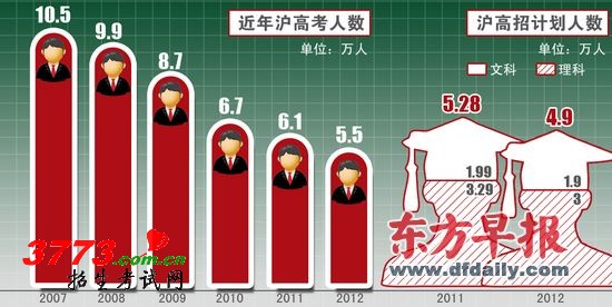 昨天,高考咨询平台“2012高考咨询大直播”传出消息,2012年上海高考人数为5.5万,招生计划4.9万人,相比去年考生减少了约6000人,招生计划减少了约4000人。