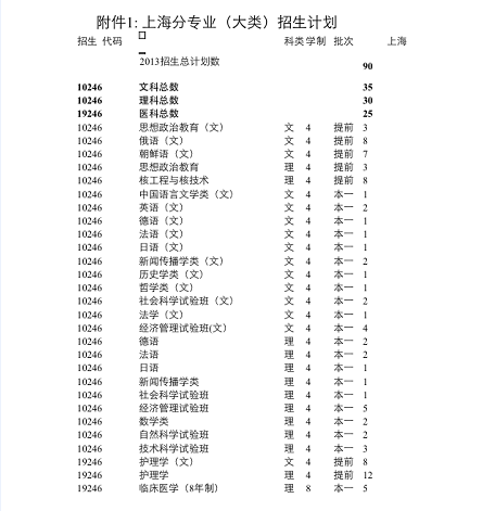 【新民网·独家报道】今天(5月9日)下午,复旦大学公布了2013年上海高考招生方案。新民网记者看到,今年复旦大学在上海高考统招计划总数为90人,其中提前批文科18人、理科11人、医科20人,第一批文科17人、理科19人、医科5人,涵盖了经济管理试验班、新闻传播学类、数学类、临床医学(8年制)等几乎所有主要学科大类。