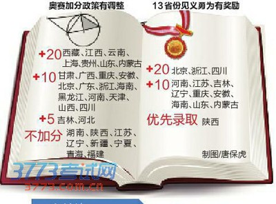 盘点今年新调整的31省份高考加分照顾政策发现,此次高考加分照顾政策调整涉及奥数、科技类、体育项目、少数民族等传统加分领域。例如今年四川高考加分项目和去年相比共删除29个,另外还有17个项目缩减了加分分值。而北京市在2014年高考中,体育特长生加分项目由原本的15项缩减到10项。有13个省份的高考加分项目中,提到了思想品德及见义勇为。