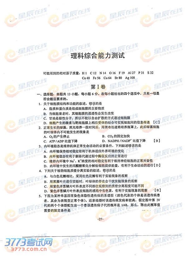 2014陕西高考理综试题及答案