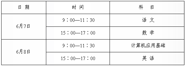 省招办要求,各市(区)招办原则上要将高职单招考点集中、独立设置。考试时间安排为:6月7日上午语文,下午数学;6月8日上午计算机应用基础,下午英语。