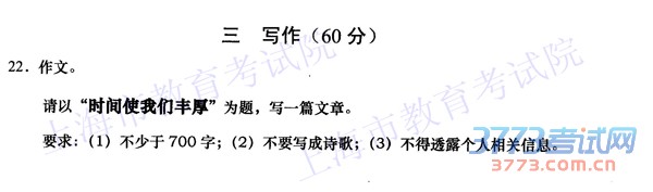 今天上午首场语文考试结束后,上海市教育考试院第一时间公布了语文作文题目:请以“时间使我们丰厚”为题,写一篇文章。要求不少于700字,不要写成诗歌,不得透露个人相关信息。