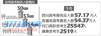 记者4月17日从有关方面获悉,今年四川高考报名人数再创历史新高,从去年的53.8万人增加到57.17万人,比去年增加了3.37万人。
