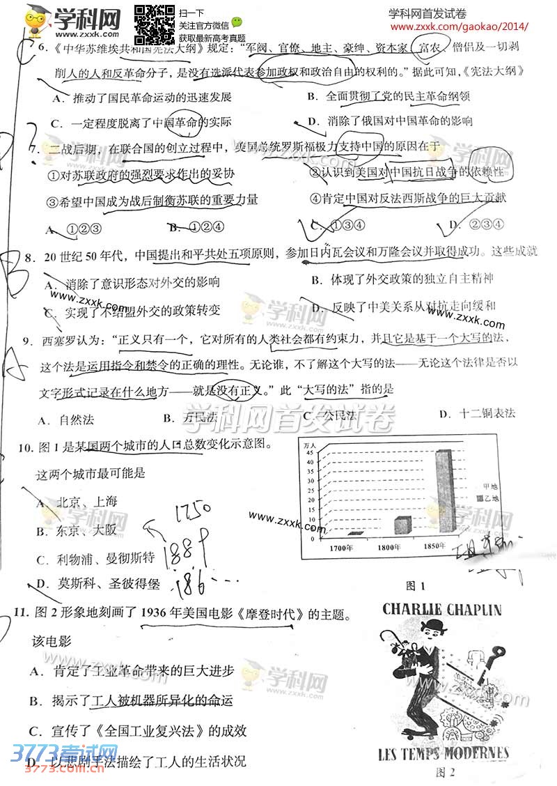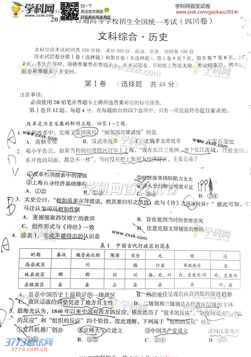 [组图]2014四川高考文综地理历史试题及部分答案