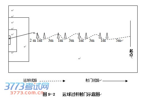(1)测试方法:从罚球区线中点垂直向场内延伸至20米处画一条平行于球门线的横线做为起始线,考生先将球放在起始线上,然后运球依次绕过8根标志杆后起脚射门(如图9-2所示),球动开表,当球从空中或地面越过球门线时停表。凡出现漏杆、射门偏出球门或球中横梁或立柱弹出,均属犯规,不计成绩。每人两次机会,记其中一次最佳成绩。