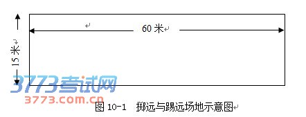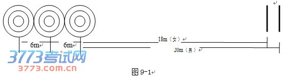 (1)测试方法:从长5米,宽10厘米的起点线中心点垂直向前分别以20米、26米、32米处(女子为18米、24米、30米)为圆心各画三个同心圆为传准目标,每个同心圆的半径分别为1米、2米、3米(如图9-1所示)。考生从限制线上或线后,按由近到远的顺序,向各同心圆连续传球2次,脚法不限。