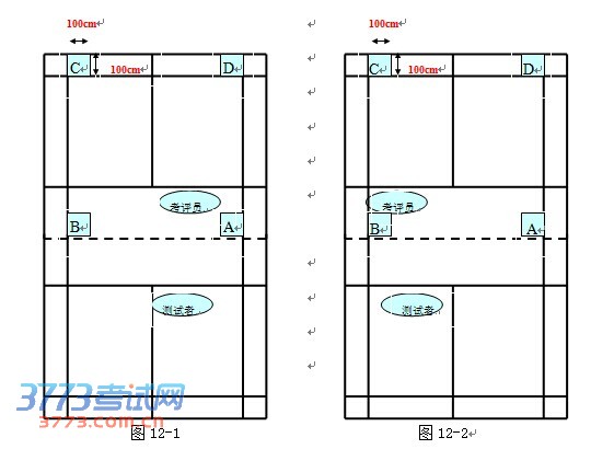 (2)测试要求:考生必须站在前发球线外准备,落点必须严格按照A、B、C、D的顺序走。(A、B、C、D的面积都是100 cm×100cm,从场地线的外沿测量。),并且最后两球要依照规定在测试前提前选择落点区域。