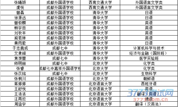 四川新闻网成都5月13日讯(记者 陈淋)5月13日,成都市招生考试委员会办公室在官方公布了成都市2015年保送生录取名单。四川新闻网记者了解到,今年有14名学生保送进北京大学和清华大学。其中,成都外国语学校占了9个保送名额,分别有8个同学保送进清华大学,4位同学进入英语专业学习3位同学进入日语专业,还有1位同学进入经济与金融(国际班)。此外,成都七中有2名同学保送进清华大学的化学类专业和医学实验班,1名同学保送进北京大学的生物科学专业。成都七中嘉祥外国语学校有1名同学保送进北京大学化学类专业学习。