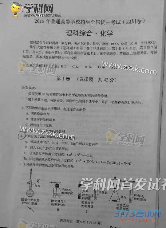 [组图]2015四川高考理综试题及部分答案