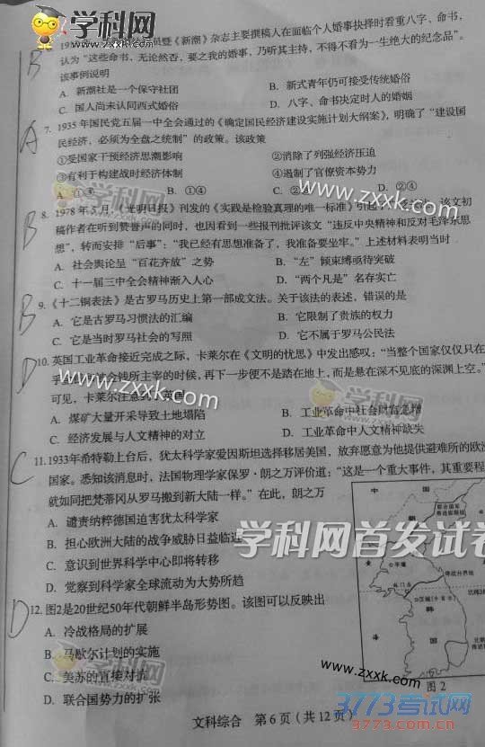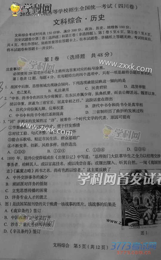[组图]2015四川高考文综历史试题及部分答案