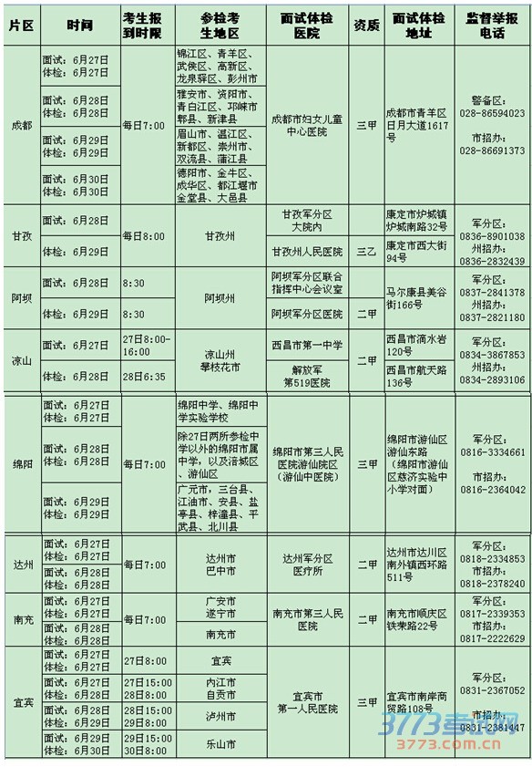 从四川省教育考试院获悉,省招办公布了2015年四川省军队院校和国防生招生面试、体格检查日程安排。根据安排,面试及体格检查时间为6月27日至30日。具体时间安排如下: