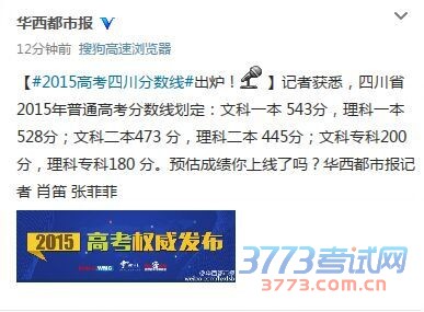 3773高考网讯 2015年四川高考分数线已经公布:文科一本 543分,理科一本 528分;文科二本473 分,理科二本 445分;文科专科200分,理科专科180 分。