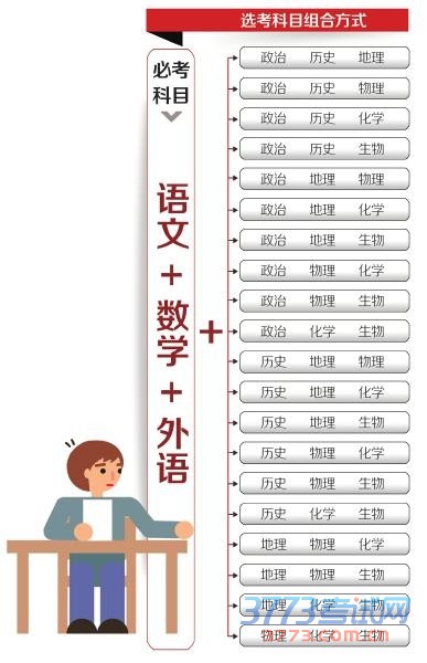 政策:考生总成绩由统一高考的语文、数学、外语3个科目(必考科目)成绩和高中学业水平考试3个科目(选考科目)成绩组成。高中学业水平考试3个科目由考生根据本人兴趣特长和拟报考学校及专业要求,从思想政治、历史、地理、物理、化学、生物等普通高中学业水平考试科目中选择。