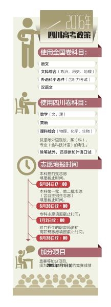 距离高考还有30多天,5月5日,四川省高等教育招生考试委员会、四川省教 育 厅 发 布2016年我省普通高校招生政策,今年高考试题中的语文、文科综合(政治、历史、地理),以及外语科小语种(含听力考试)、汉语文使用全国卷;数 学(文、理)、英语、理科综合(物理、化学、生物)使用我省自主命制试卷(听力考试使用全国统一命制的试题)。