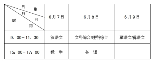 藏、彝文一类模式高考于6月7日开始举行,各科目考试时间具体如下: