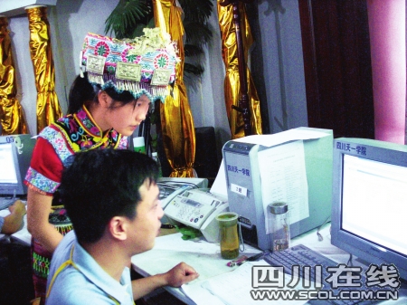宜宾的苗族女孩杨兰今年文科考了503分,报考西南民大会计专业。昨日,当她走进戒备森严的录取场录检组时,忍不住向工作人员打听自己是否已被录取。录取场录检组工作人员轻点鼠标键入杨兰准考证号后,电脑屏幕上显示学校正在对预录取的考生进行批量阅档。