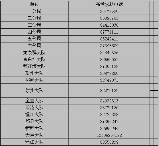 据了解,2013年全国普通高校统一招生考试将于6月7、8日进行,成都共有77498名高考考生将分别在全市54个考点参加高考(中心城区21个、区(市)县考点33个考点)。为切实为高考服好务,保障一个畅通的交通环境,成都交警分别召开动员部署会,推出了“为考生服务、提供方便”,设置了“考生服务热线”电话。考生在高考期间,如遇突发情况,均可拨打服务热线进行求助。