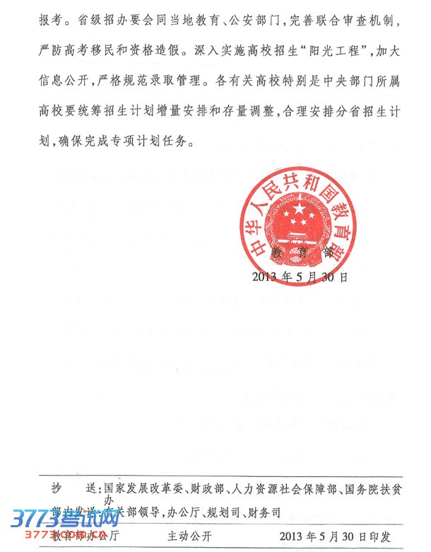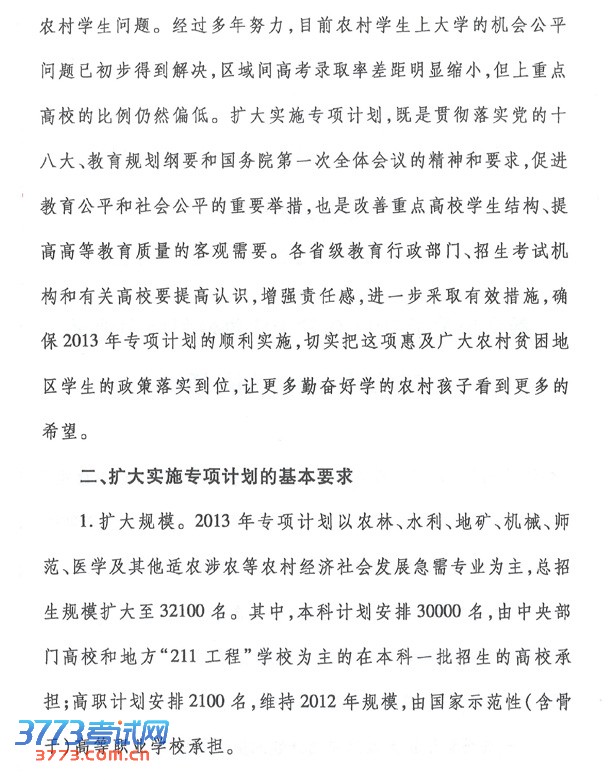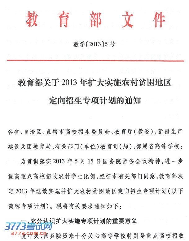 现将《教育部关于2013年扩大实施农村贫困地区定向招生专项计划的通知》(教学〔2013〕5号,以下简称《通知》)转发你们,并就有关事项通知如下,请认真贯彻执行。