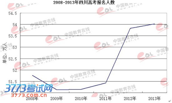 3773考试网四川高考志愿填报指南显示:近几年,四川高考报名人数在不断增长。2008年四川高考人数有51.76万人;2009年有51.13万人;2010年有51.15万人,2011年有51.43万人,2012年增长到了53.83万人。