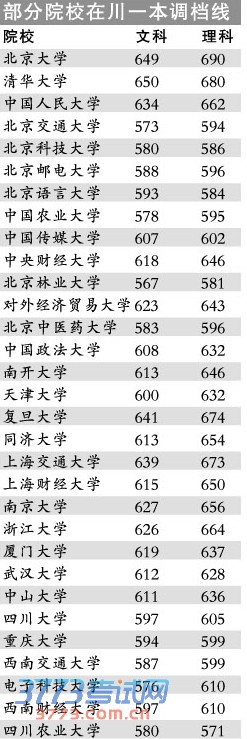 同时,四川5所“211高校”在川一本调档线也于昨日公布。它们分别是,四川大学:文科597,理科605;电子科大:文科576,理科610;西南交大:文科587,理科599;西南财大:文科597,理科610;四川农业大学:文科580,理科571。