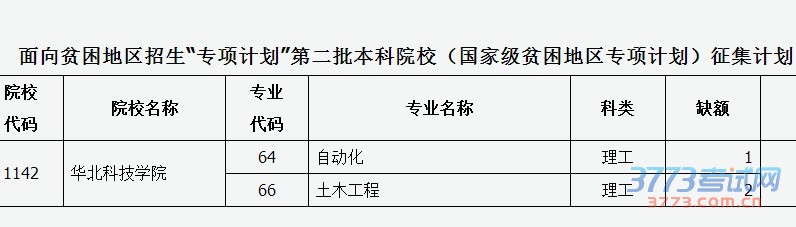 目前,面向贫困地区招生“专项计划”第二批本科院校华北科技学院因部分考生专业不服从调剂退档后招生计划尚有缺额。现予公布,公开征集志愿。