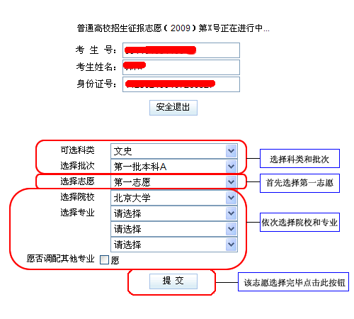 注:如果没有通过身份检测,那么可能是以下原因: (1)考生号或身份证号填写错误; 考生必须符合填报当次志愿的要求: ( 1 )分数满足该批次征集志愿的要求; ( 2 )科类满足批次征集志愿的要求; ( 3 )目前尚未被其他院校录取。 2、进入征报志愿界面。