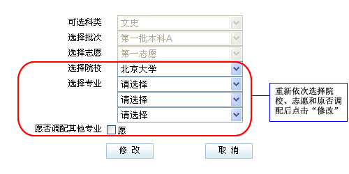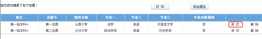 4、修改志愿 1、在“已成功填报了如下志愿”信息列表中,找到要修改的志愿,点击右边的“修改”按钮。 2、重新依次选择院校、专业和愿否调配,然后点击提交按钮进行修改。