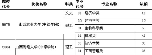 二B院校山西农业大学(中德学院)、山西财经大学(中德学院)招生计划仍有缺额。两院校执行最低控制分数线430分,从高分到低分投档。山西农业大学(中德学院)为中外合作办学,国内学费每年15600元人民币,国外学费:“1+4”模式总计8900欧元(包括德国一年语言密集培训和专业预备课程等费用),其中第一学年1000欧元,入学前交纳,其余7900欧元,出国前交纳。“2+2”模式总计10000欧元(包括大学两年语言培训、德语一学期密集培训及两年专业课程费用),其中第一学年1000欧元,入学前交纳,第二学年2000欧元,其余7000欧元,出国前交纳。所有学生享受在校生助学金和德方设立的“中德教育专项奖学金”。院校咨询电话:0354-6289768,6180549:0351-6784028,6784029山西财经大学(中德学院)属中外合作办学,学费较高(包括中德双方学费),建议考生慎重填报。院校咨询电话:0351-7666571